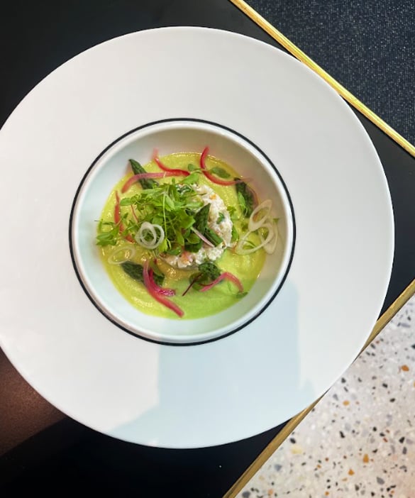 - Pour the cold asparagus velouté into the bottom of the plate .