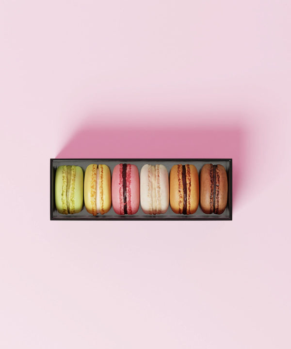 Assortment of 6 pistachio, raspberry, vanilla, caramel, chocolateand lemon macaroons